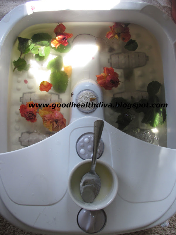 Homemade pedicure with homemade goodies like dried roses, mint from the garden, homemade foot scrubb...